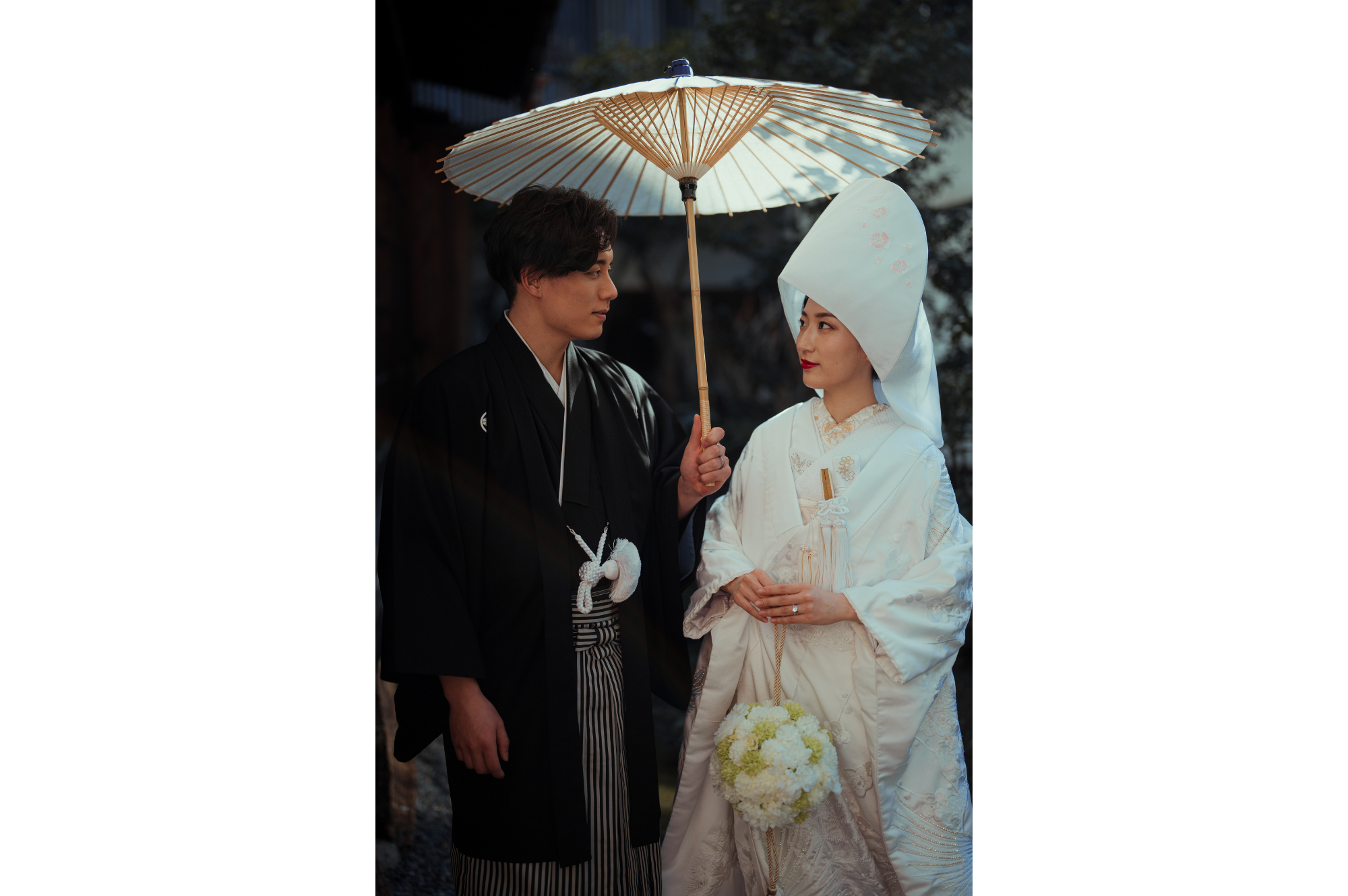 เจ้าสาวมักสวม ชิโรมุกุ (Shiromuku) สีขาวล้วน สื่อถึงความบริสุทธิ์และการเริ่มต้นชีวิตใหม่ หรือ อุจิคาเคะ (Uchikake) กิโมโนคลุมลายงดงาม ส่วนเจ้าบ่าวสวมมงสึกิและฮากามะ