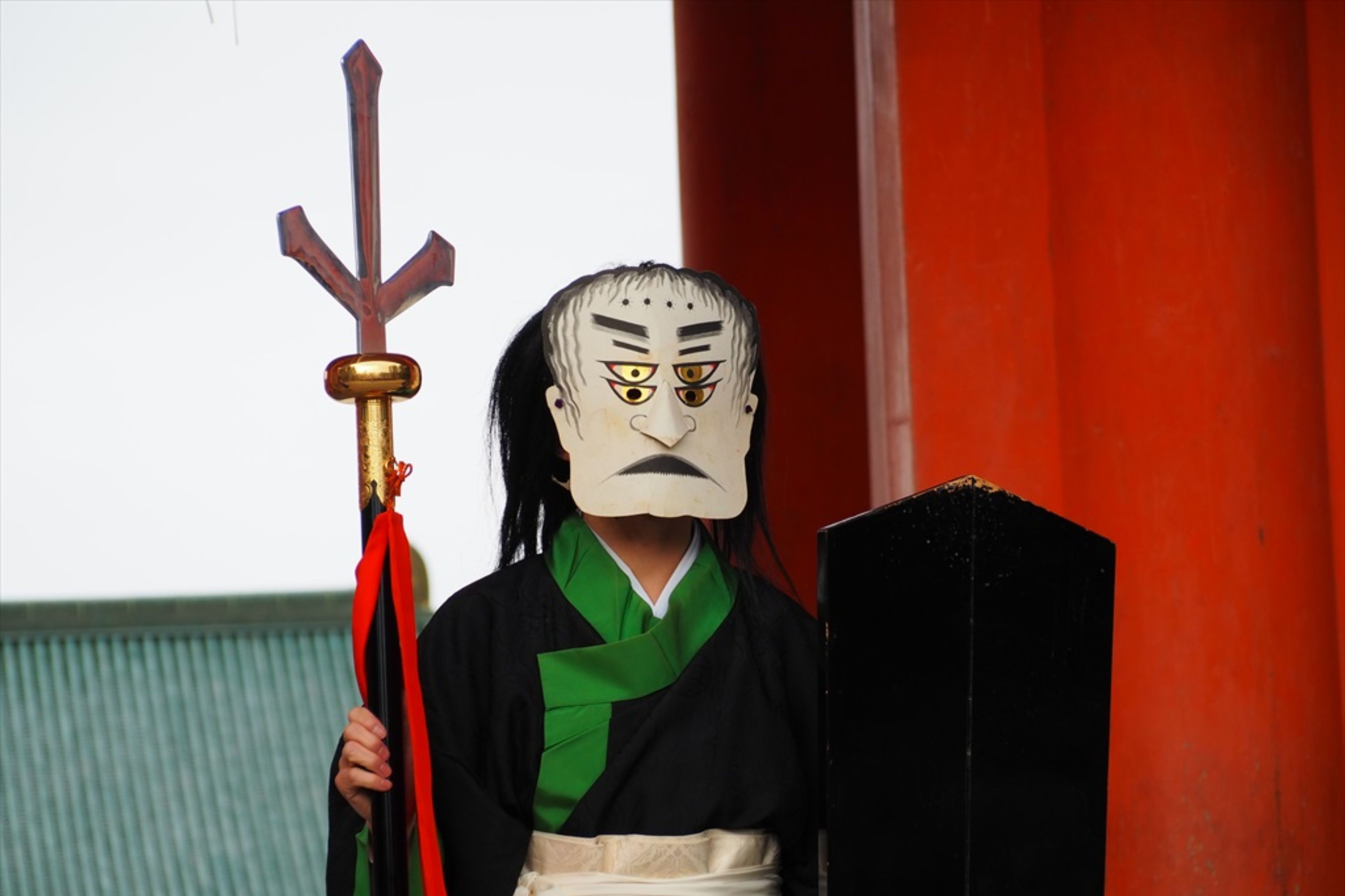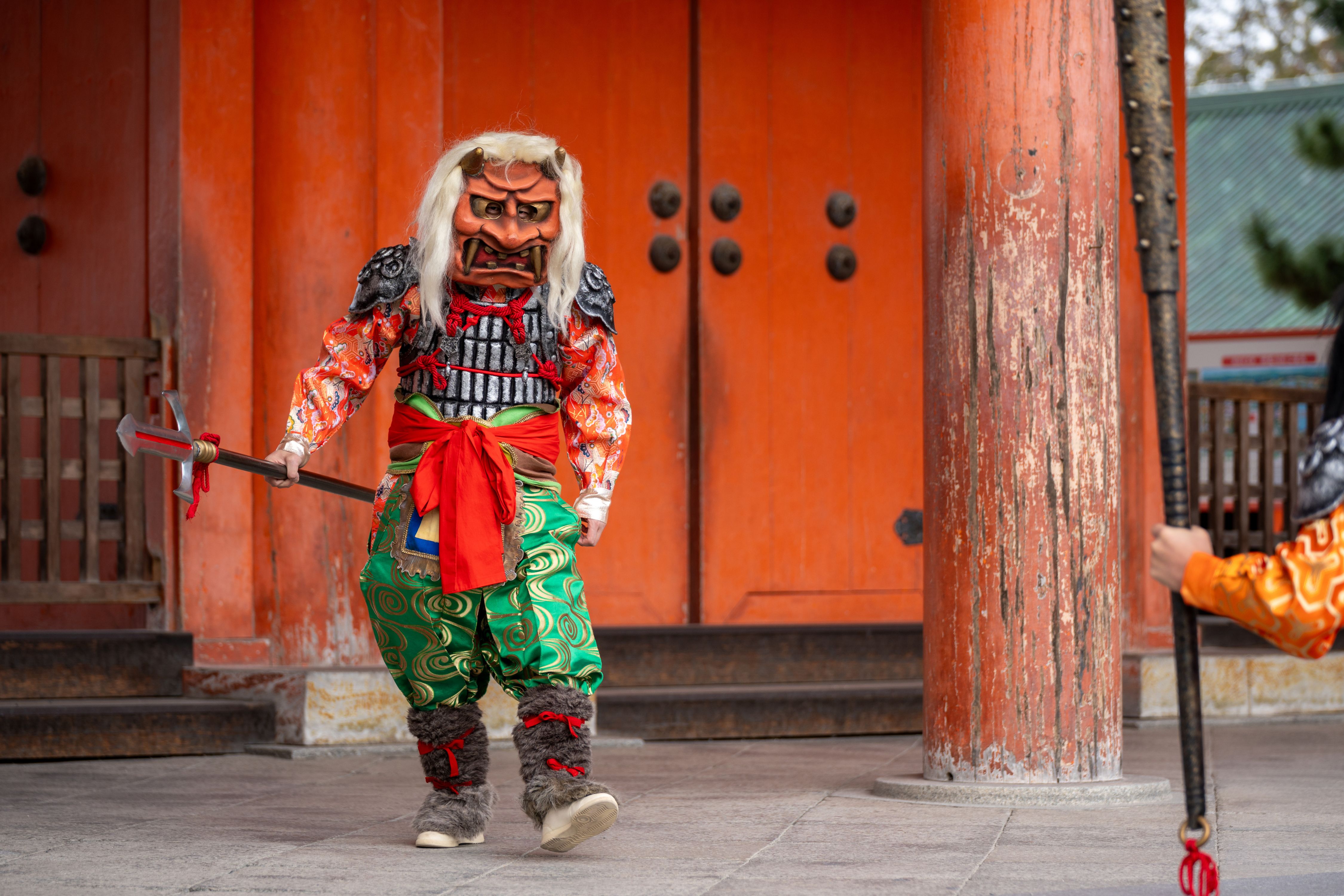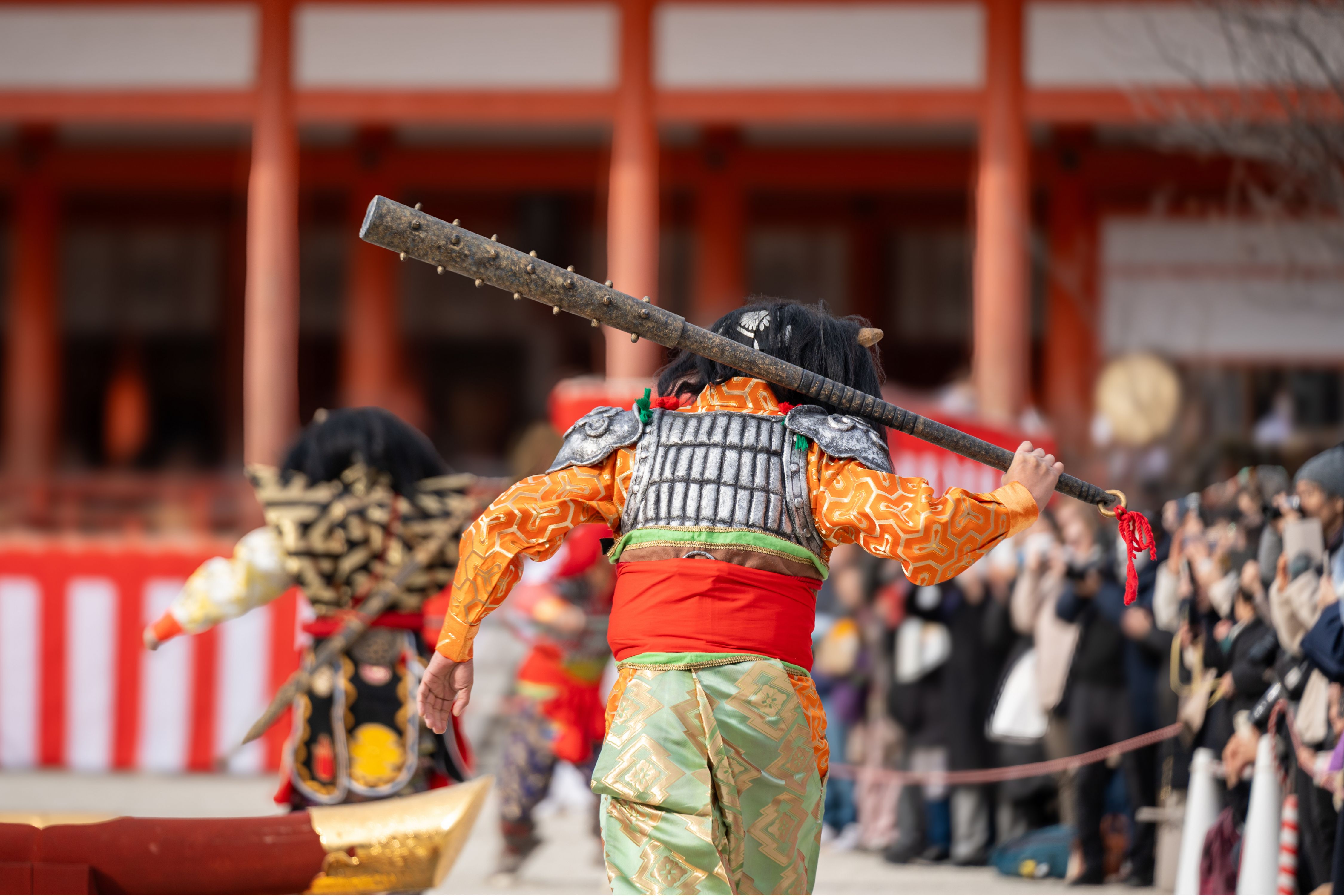 ในช่วงบ่ายจะมี ยักษ์ตัวใหญ่ สีแดง สีน้ำเงิน และสีดำ บุกเข้ามาในบริเวณศาลเจ้าเพื่อสร้างความวุ่นวาย จากนั้นจะมีการแสดงละครรำ Kyogen (ละครตลกโบราณ) ให้ชมกัน
