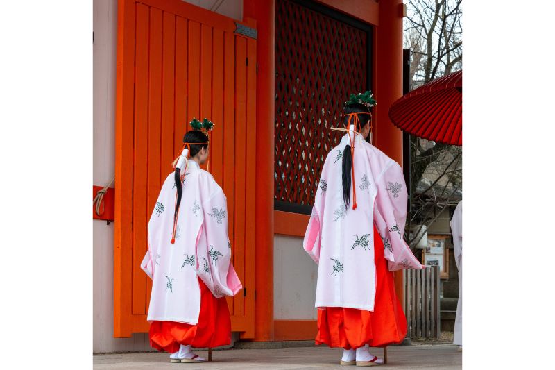 บางครั้งพวกเธอก็ช่วยทำความสะอาด จัดสวน ต้อนรับผู้มาเยือน หรือให้ข้อมูลนักท่องเที่ยว เรียกได้ว่าเป็นหน้าตา ของศาลเจ้าเลยก็ว่าได้