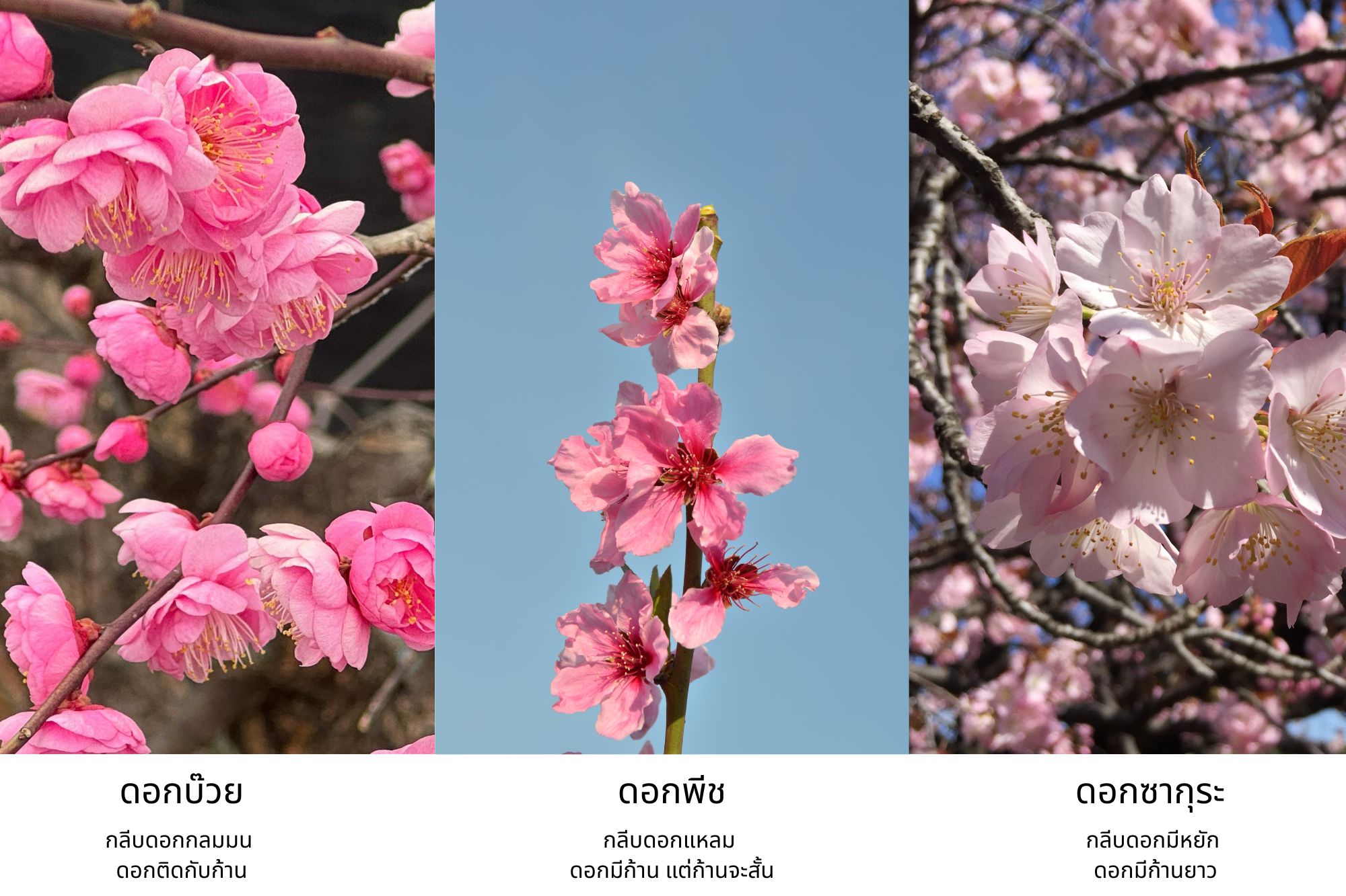 หลายคนมักสับสนระหว่างดอกไม้ทั้ง 3 ชนิด เพราะล้วนมีสีชมพูหรือขาวคล้ายกัน และบานในช่วงใกล้เคียงกัน แต่จริง ๆ แล้วมีความแตกต่างชัดเจนทั้งรูปร่างและช่วงเวลา