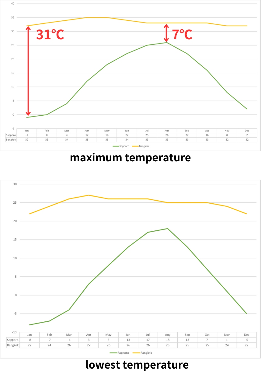 อุณหภูมิสูงสุดและต่ำสุดในฮอกไกโดนั้น เมื่อนำมาเปรียบเทียบกับอุณหภูมิในกรุงเทพฯ แล้ว มีความต่างกันถึง 31℃ โดยเฉพาะในหน้าหนาว ฮอกไกโดนั้นมีอากาศหนาวมาก และในช่วงเดือนกุมภาพันธ์ของทุกปีที่มีการจัดเทศกาลหิมะ อุณภูมิสูงสุดจะอยู่ที่ประมาณ 0℃